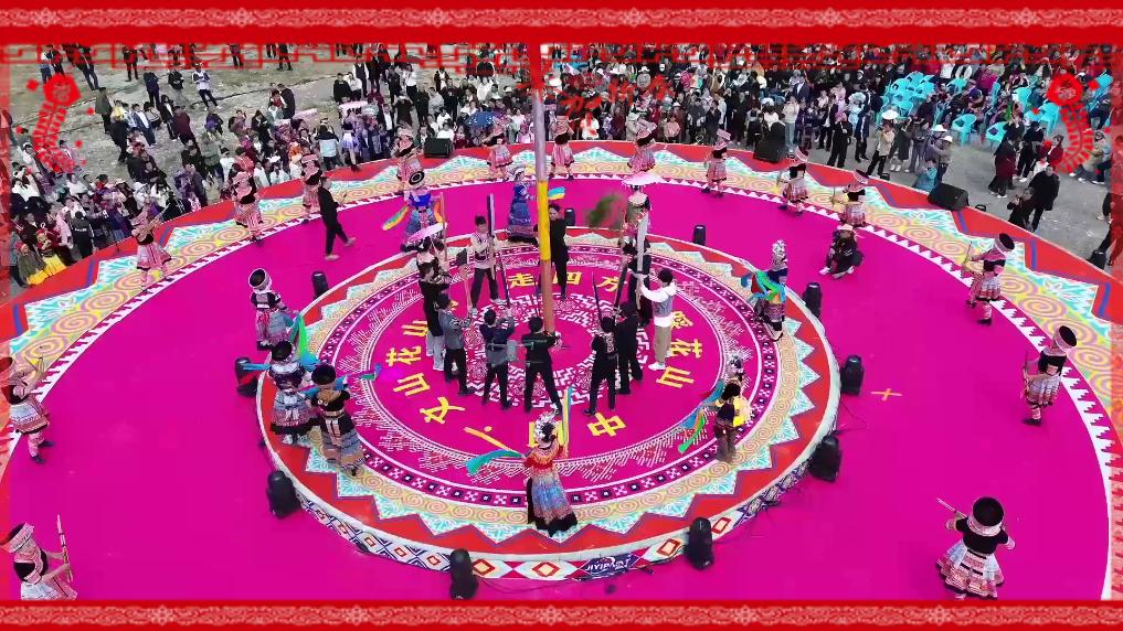 春节期间,苗族群众会举办踩花山活动,这是苗族群众千百年来代代相传昭示后人团结和睦、友善往来的活动。在云南文山壮族苗族自治州文山市,苗族群众身着盛装汇集到广场,绕广场中央的花杆跳舞,传递节日的喜悦。