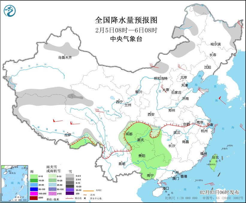 2月5日08时至6日08时,新疆沿天山地区和南疆盆地南部、内蒙古北部、黑龙江东部、西藏西部和北部、青海西部等地部分地区有小到中雪或雨夹雪。西藏东南部、湖南西部、四川盆地、重庆大部、贵州、广西大部、台湾岛等地部分地区有小雨。西藏大部、青海中南部和东部、内蒙古大部、山西中部、山东半岛等地部分地区有4~6级风,其中,西藏北部、青海南部部分地区有8~9级风。东部和南部海区有7~8级,阵风9~10级大风。