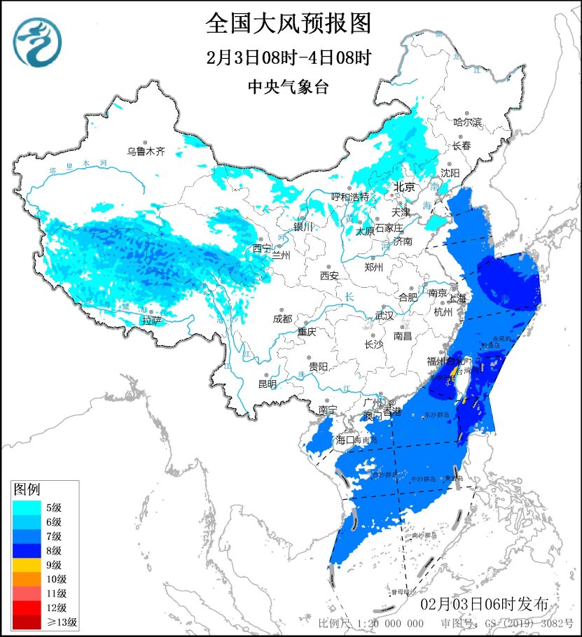 中央气象台2月3日06时发布大风蓝色预警:预计,2月3日08时至4日08时,西藏大部、青海中南部和东部、内蒙古大部、华北北部和西部等地将有5~6级、阵风7~8级的大风,其中西藏北部、青海南部部分地区风力可达6~8级、阵风9~10级。黄海大部海域、东海大部海域、台湾海峡、台湾以东洋面、巴士海峡、南海大部海域、北部湾将有7~8级、阵风9级的大风,其中台湾海峡、巴士海峡的部分海域风力可达9级、阵风10级。