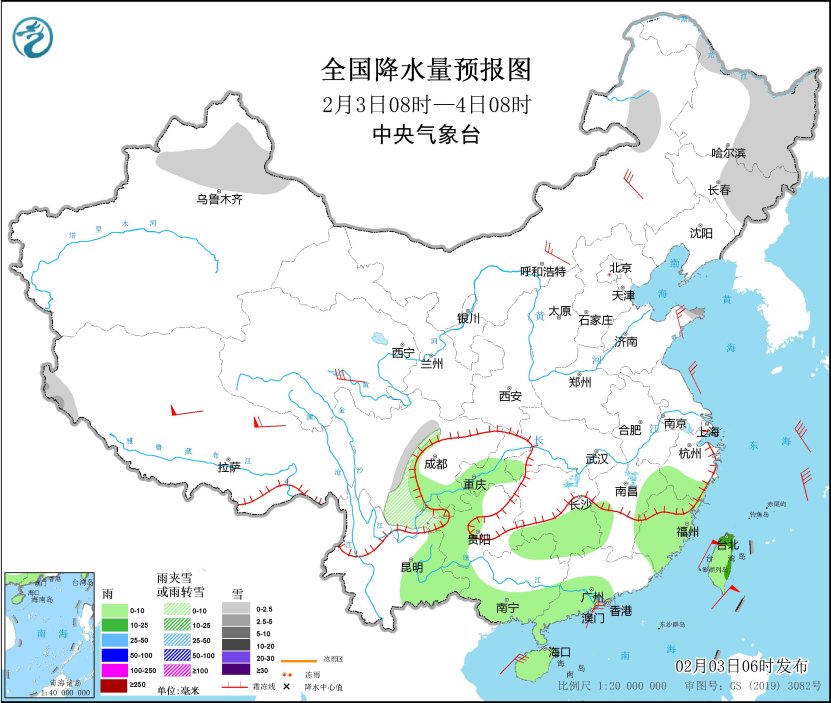 全国降水量预报图(2月3日08时-4日08时)