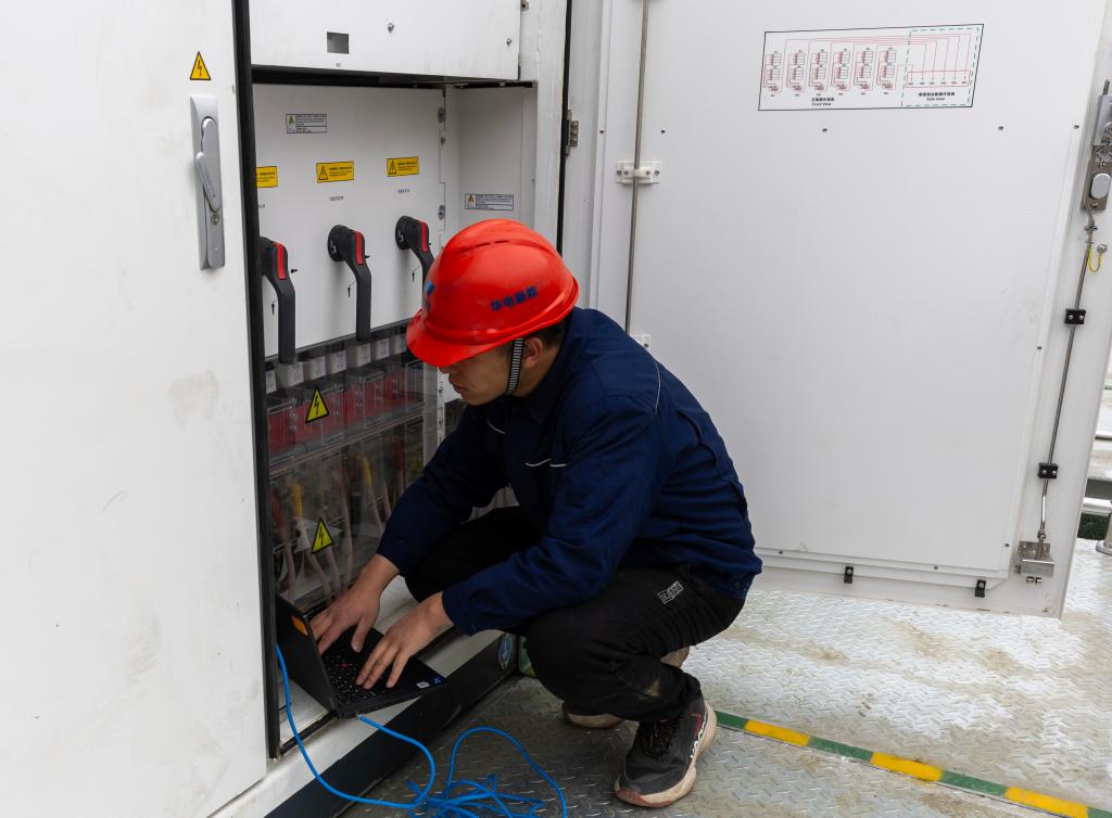 在华电西藏才朋光伏电站升压站,工作人员正在检查设备。新华社记者姜帆 摄