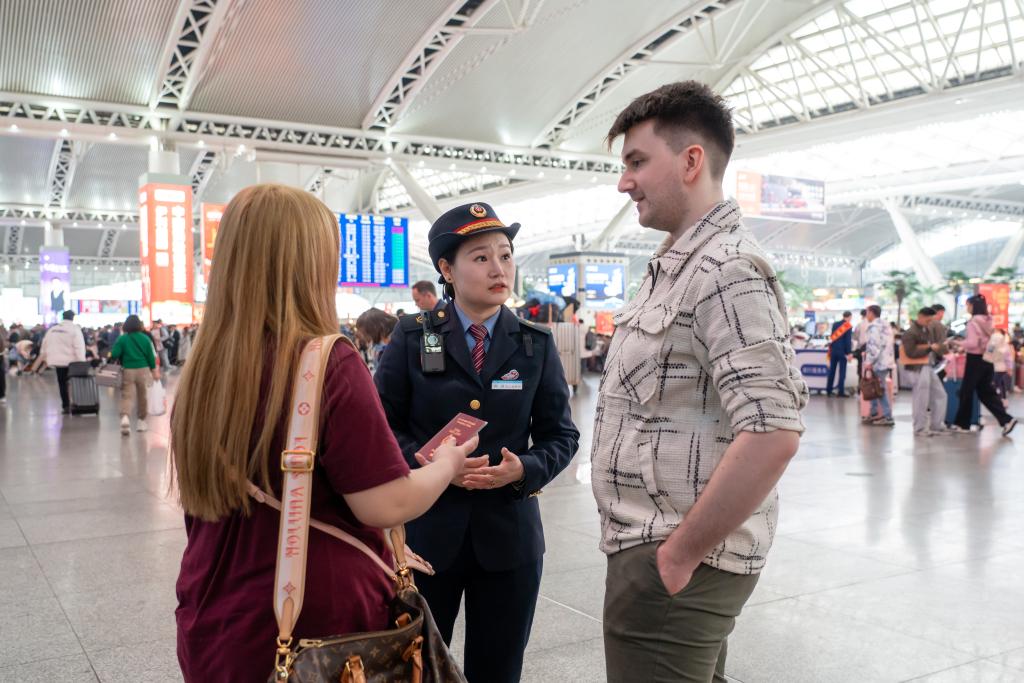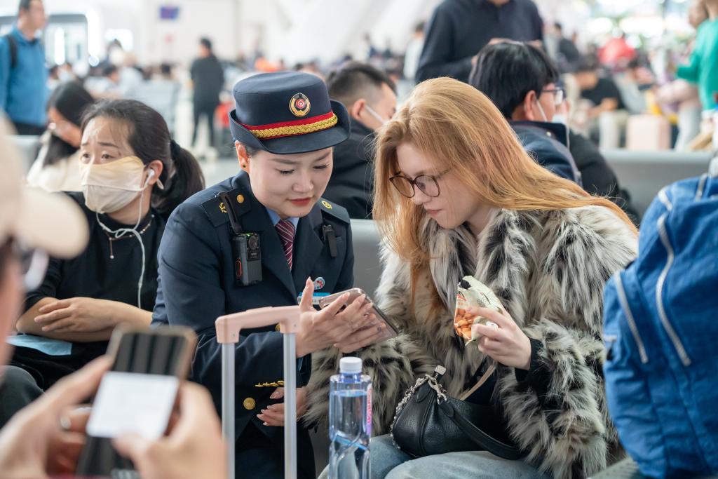 图为广州南站客运员陈璇在为外国旅客做乘车指引。新华社发