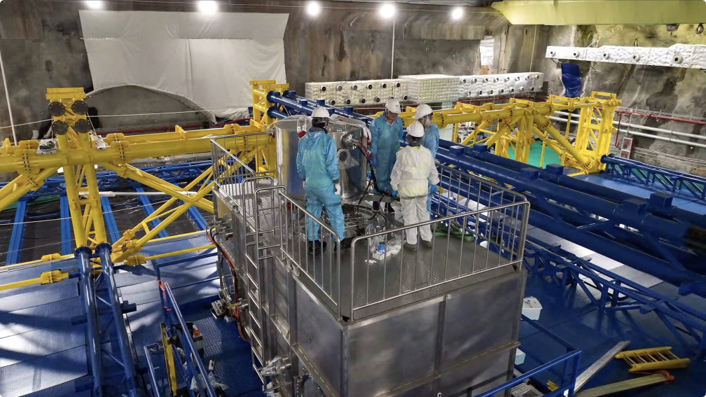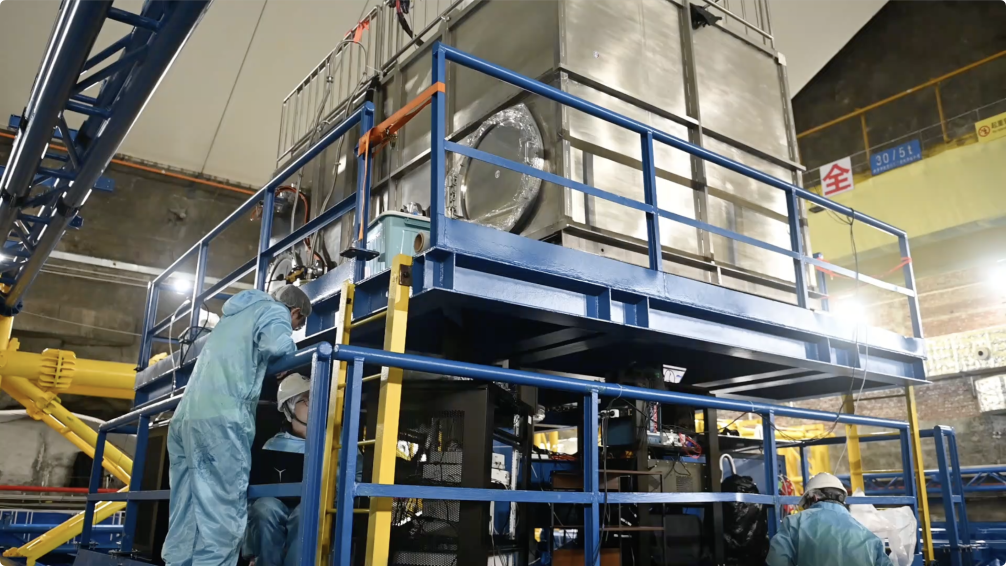 江门中微子实验位于广东江门开平市,它的核心探测设备(中心探测器)是一个有效质量2万吨的液体闪烁体探测器。布满中心探测器内壁的光电倍增管共同探测中微子被液体闪烁体“俘获”时产生的闪烁光,并将光信号转换为电信号输出。