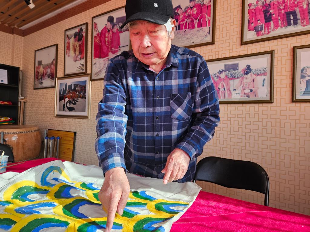 图为张仲发向记者介绍龙皮图案的画法。新华社记者于也童 摄