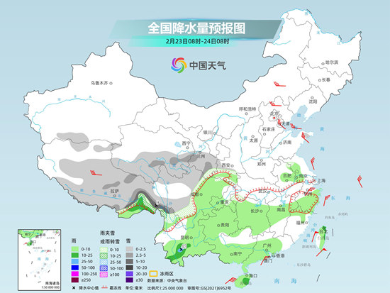 周末两天,暖湿气流频频北上,南方仍将有大范围阴雨天气,同时西藏东南部、川西高原北部、甘肃南部等地多降雪天气。