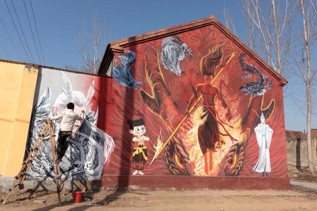2月16日,在山东省淄博市周村区沈家村,画家创作哪吒彩绘。新华社发(刘天宇摄)