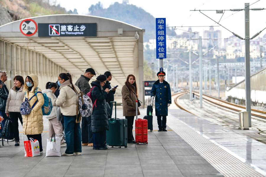 春运返程客流高峰,一趟趟驶离家乡的列车上,大包小包的行李箱延续着家乡的味道。