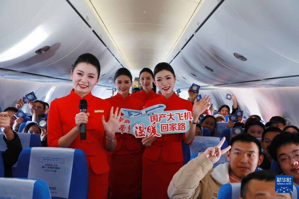 2025年1月14日,在南航CZ8233广州—成都天府航班上,空乘人员开展C919国产大飞机投入春运主题活动。新华社记者 王瑞平 摄