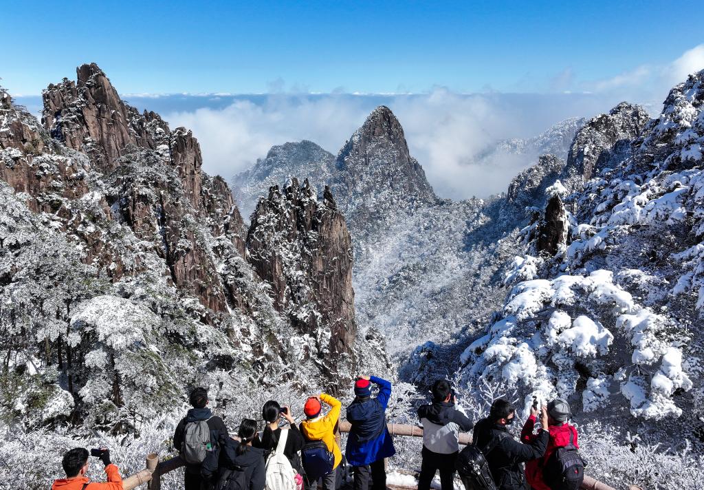 2月24日,游客在安徽省黄山风景区欣赏春雪。新华社发(施亚磊摄)
