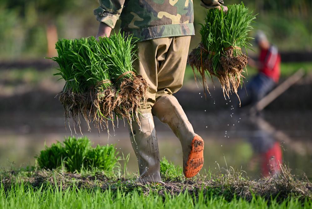2月20日,海南省白沙黎族自治县牙叉镇的农民在搬运秧苗。新华社记者 郭程 摄