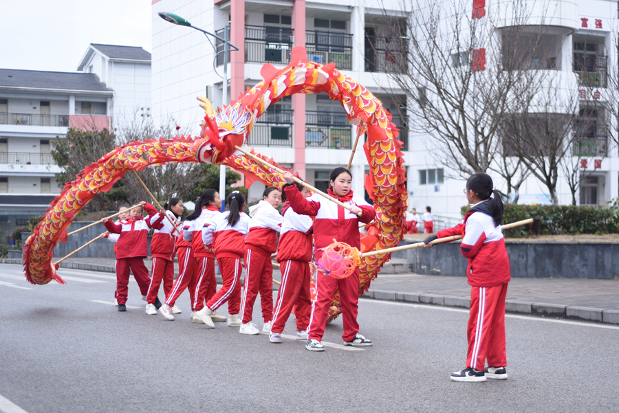 2025年2月25日,贵阳市花溪区青岩小学的学生在大课间练习舞龙。新华社记者 郑明鸿 摄