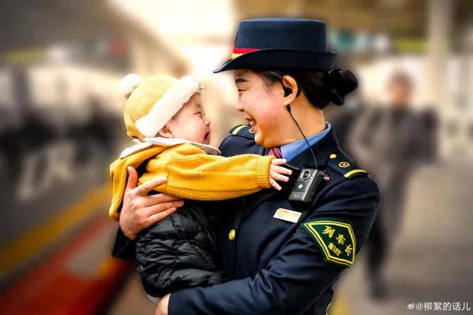 南昌客运段列车长何芳服务小旅客。(来源:微博网友“柳絮的话儿”)