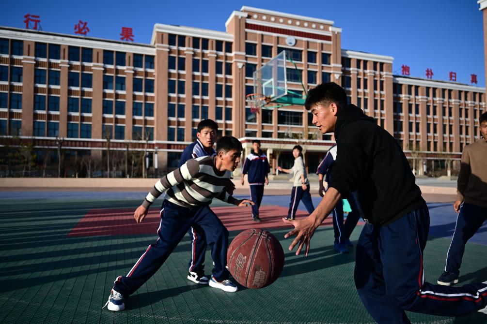 2月25日,青海省西宁市果洛西宁民族中学学生在课间活动时打篮球。 新华社记者 张龙 摄