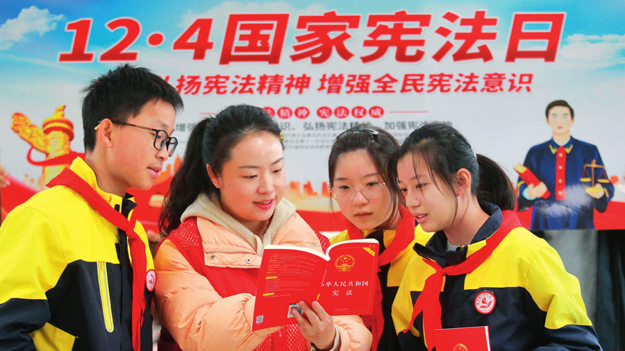 江苏省扬州市杉湾花园社区普法志愿者给学生讲解宪法知识(2023年12月4日摄)。新华社发(孟德龙摄)