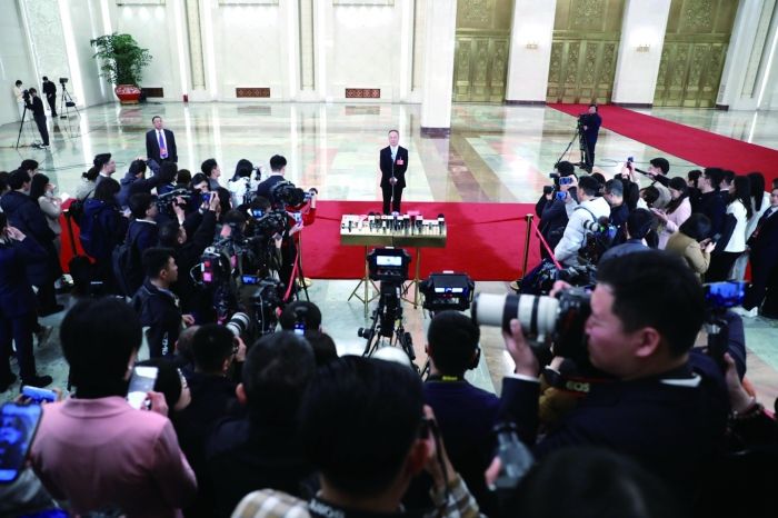 3月5日,在人民大会堂北大厅举行十四届全国人大三次会议首场“部长通道”集中采访活动。金融监管总局局长李云泽回答现场记者提问。 记者 史丽 摄