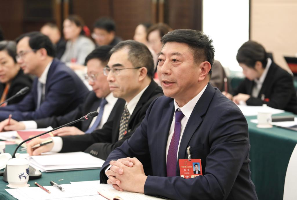3月6日,全国人大代表、江铃汽车模具钳工首席技师刘辉在十四届全国人大三次会议江西代表团审议时发言。新华社记者 熊争艳 摄