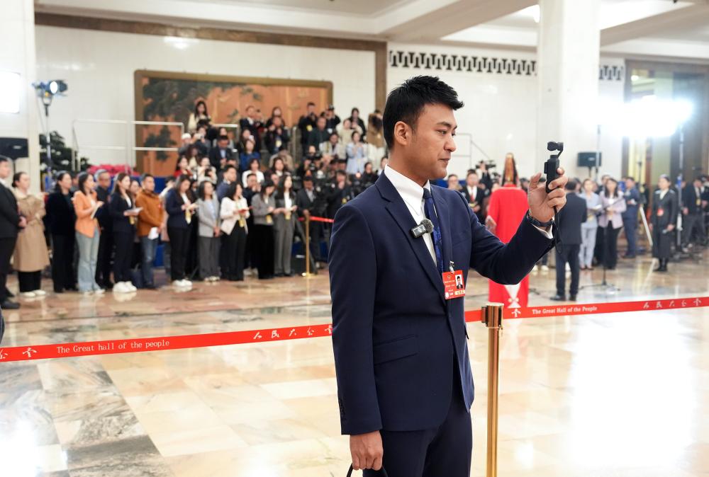 3月7日,海尼扎提·托呼提在北京人民大会堂内拍摄短视频。