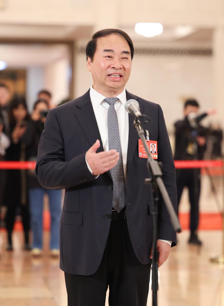 3月7日,全国政协十四届三次会议第二场“委员通道”集体采访活动在北京人民大会堂举行。这是全国政协委员张兴海接受媒体采访。