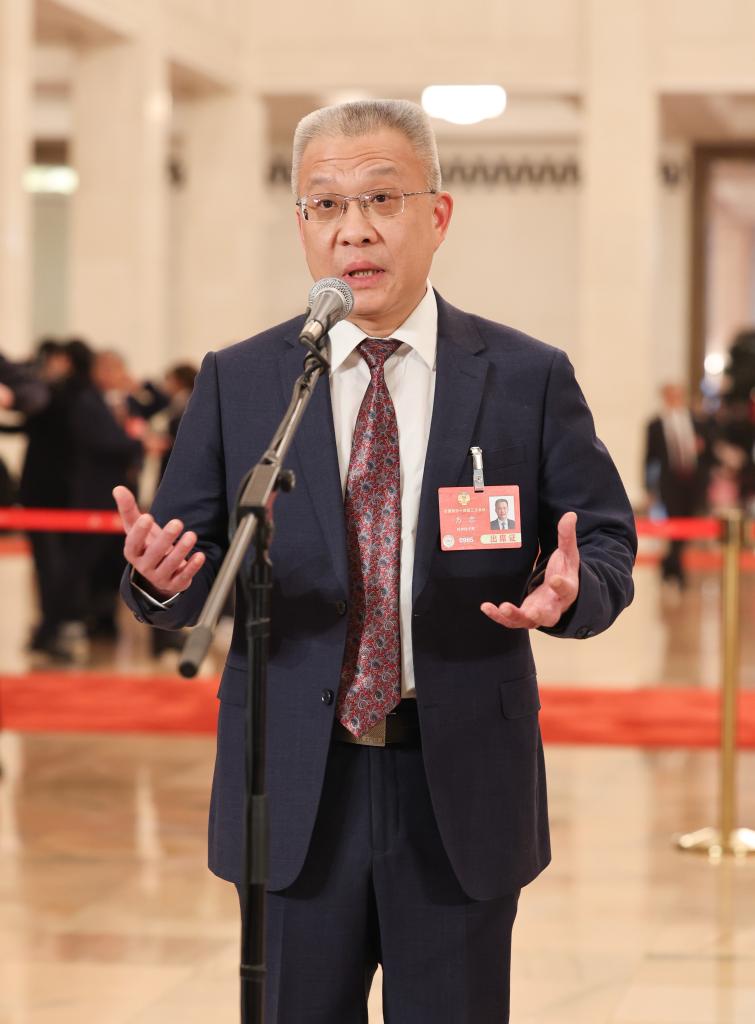 3月7日,全国政协十四届三次会议第二场“委员通道”集体采访活动在北京人民大会堂举行。这是全国政协委员方忠接受媒体采访。