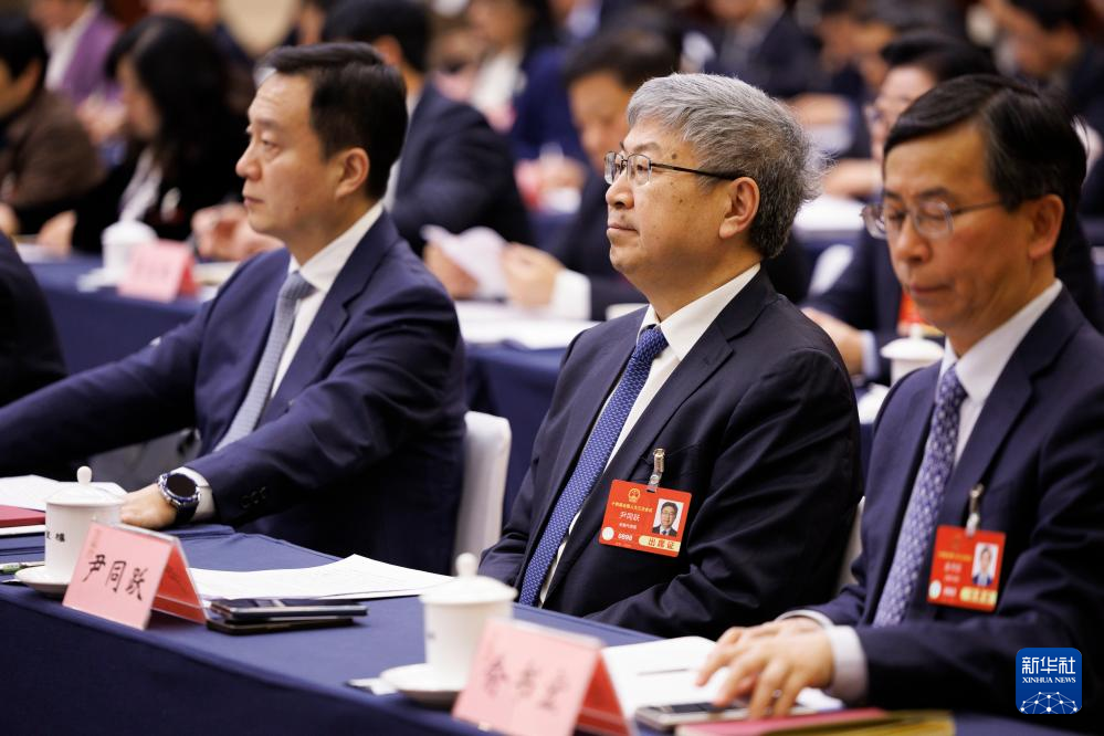3月5日,尹同跃(中)在十四届全国人大三次会议安徽代表团全体会议上听会。