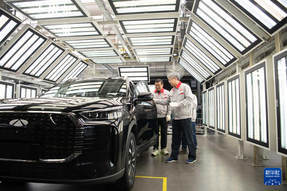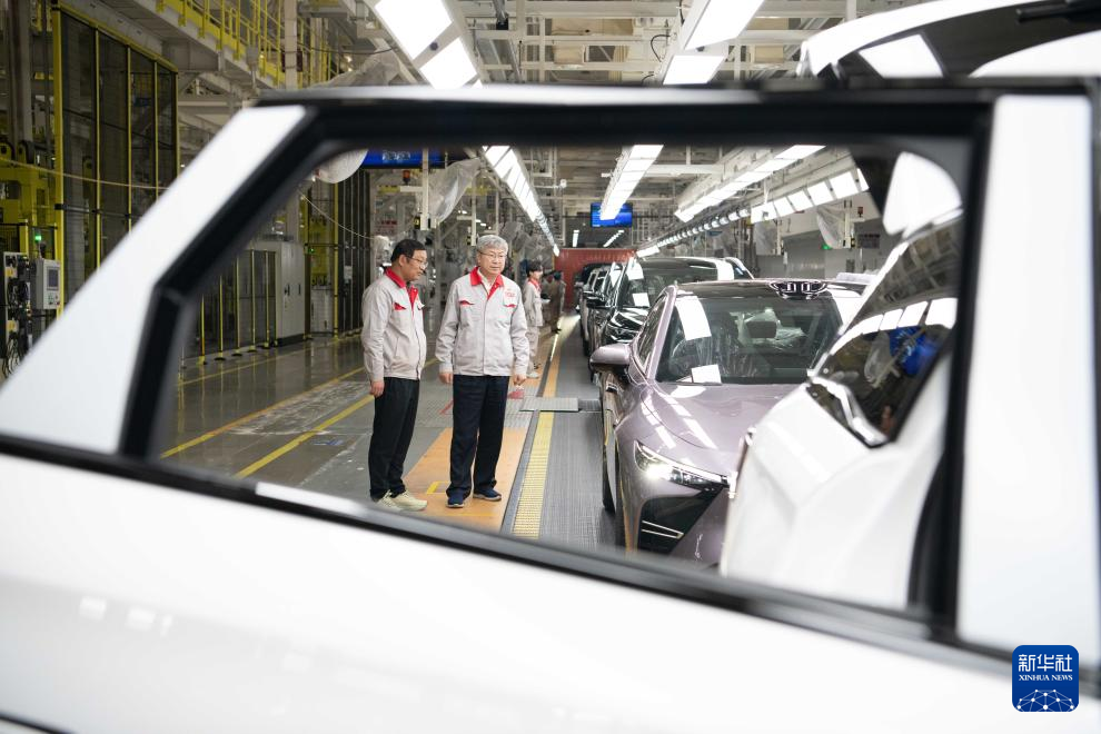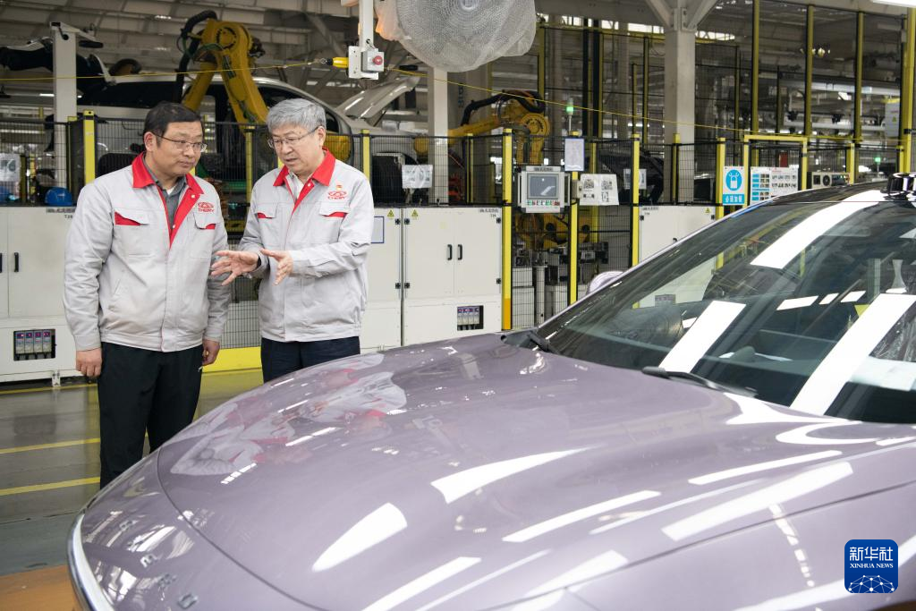 3月1日,在位于安徽省芜湖市的奇瑞智造一工厂,尹同跃(前)在了解汽车生产情况。