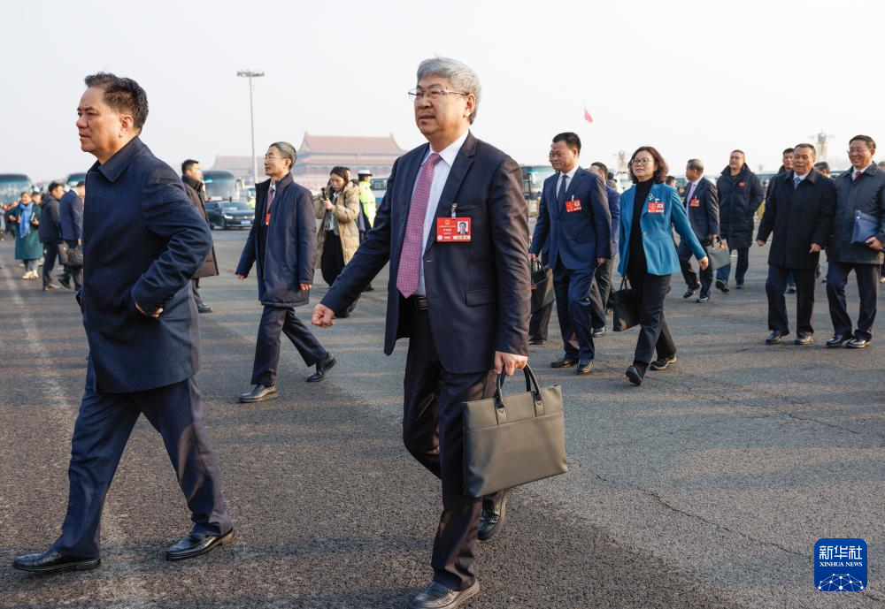 3月8日,尹同跃(中)走向北京人民大会堂,准备出席十四届全国人大三次会议第二次全体会议。