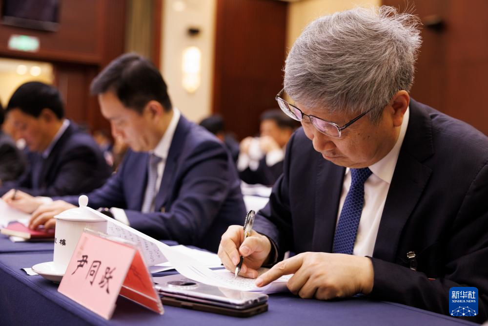 3月5日,在十四届全国人大三次会议安徽代表团全体会议上,尹同跃(右)在准备发言材料。