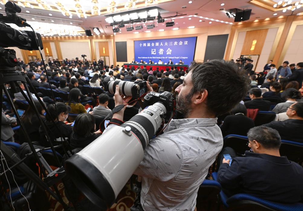 3月9日,十四届全国人大三次会议在北京梅地亚中心新闻发布厅举行记者会。民政部部长陆治原、人力资源和社会保障部部长王晓萍、住房和城乡建设部部长倪虹、国家卫生健康委员会主任雷海潮就民政、就业和社会保障、住房、卫生健康等相关问题回答中外记者提问。这是记者在现场采访拍摄。