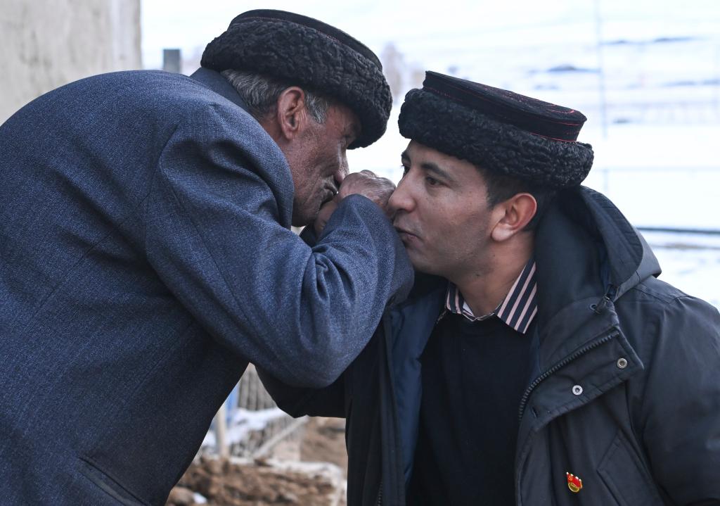 多来提曼·开米克(右)在村里走访时,与一位长者行“吻手贴面”礼(2025年1月3日摄)。新华社记者 胡虎虎 摄