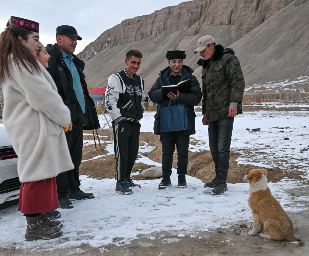 在新疆喀什地区塔什库尔干塔吉克自治县瓦恰乡夏布孜喀拉村,多来提曼·开米克(右二)在村里走访时与年轻村民交流(2025年1月3日摄)。新华社记者 陈朔 摄