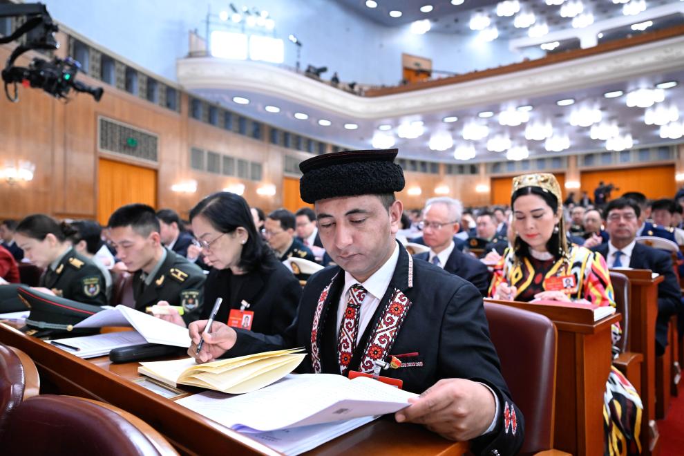 3月5日,全国人大代表多来提曼·开米克在北京人民大会堂出席十四届全国人大三次会议开幕会。新华社记者 申宏 摄