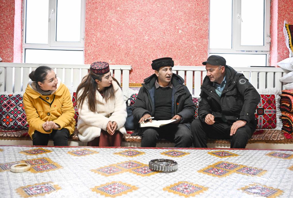 在新疆喀什地区塔什库尔干塔吉克自治县瓦恰乡夏布孜喀拉村,多来提曼·开米克(右二)在牧家乐经营主帕尔吾尼克·吾地那(右一)家中调研,听取他对乡村旅游发展的意见建议(2025年1月3日摄)。新华社记者 胡虎虎 摄