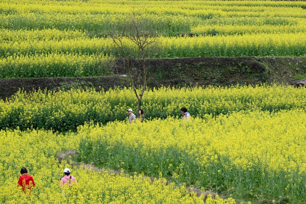 游客在黄山市徽州区呈坎镇灵山村的梯田油菜花海游玩