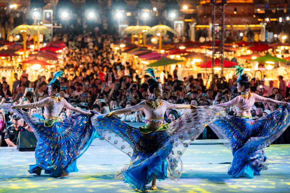 2024年12月7日,游客在位于云南省西双版纳傣族自治州景洪市的告庄西双景星光夜市观看歌舞展演。新华社记者 胡超 摄