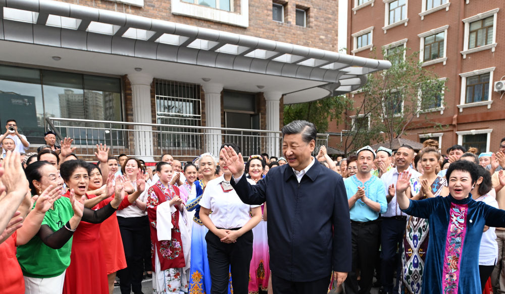2022年7月13日上午,习近平在新疆乌鲁木齐市天山区固原巷社区考察时,身着民族服装的各族群众簇拥在总书记身边,载歌载舞,向总书记表达由衷的爱戴。