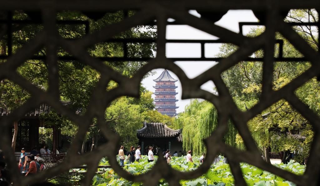2022年9月11日,游客在江苏苏州拙政园观光游览。新华社发(杭兴微摄)