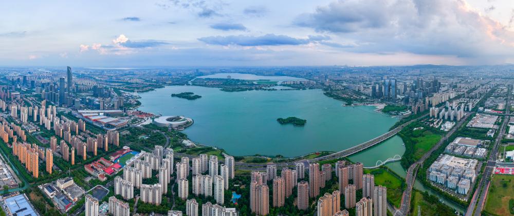 这是2024年8月29日拍摄的苏州金鸡湖(无人机照片)。新华社记者 李博 摄