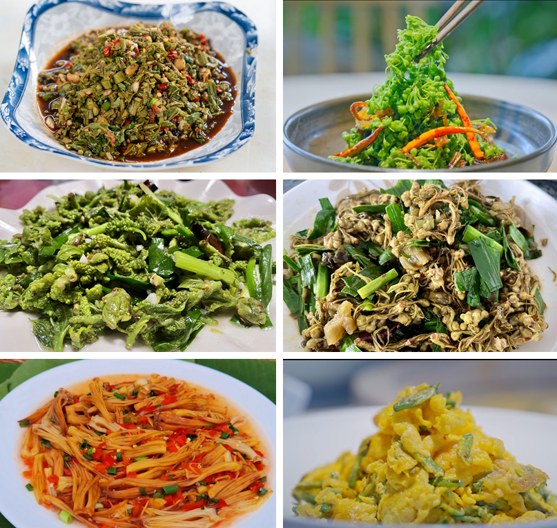 左上:凉拌香椿;右上:凉拌苦藤花;左中:炒马桑花;右中:炒棠梨花;左下:炒攀枝花;右下:金雀花炒鸡蛋。