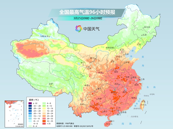 下周初,暖热程度还将加码,24日至26日华北南部到华南最高气温将有大面积超过30°C的区域,恍如初夏。其中,26日黄淮南部、江淮、江南等局地最高气温将接近或超过35°C,部分站点将打破当地三月下旬历史同期极值。省会中,杭州、长沙、南昌、武汉、南京都将接近或者打破当地3月最高温纪录。