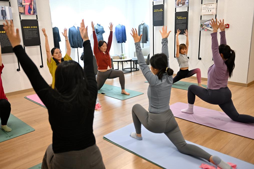 3月13日,雄安新区容东片区一处新市民夜校的学员在练习瑜伽。新华社记者 牟宇 摄