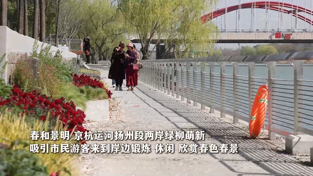 春和景明,京杭运河扬州段两岸绿柳萌新,吸引市民游客来到岸边锻炼、休闲、欣赏春色春景。