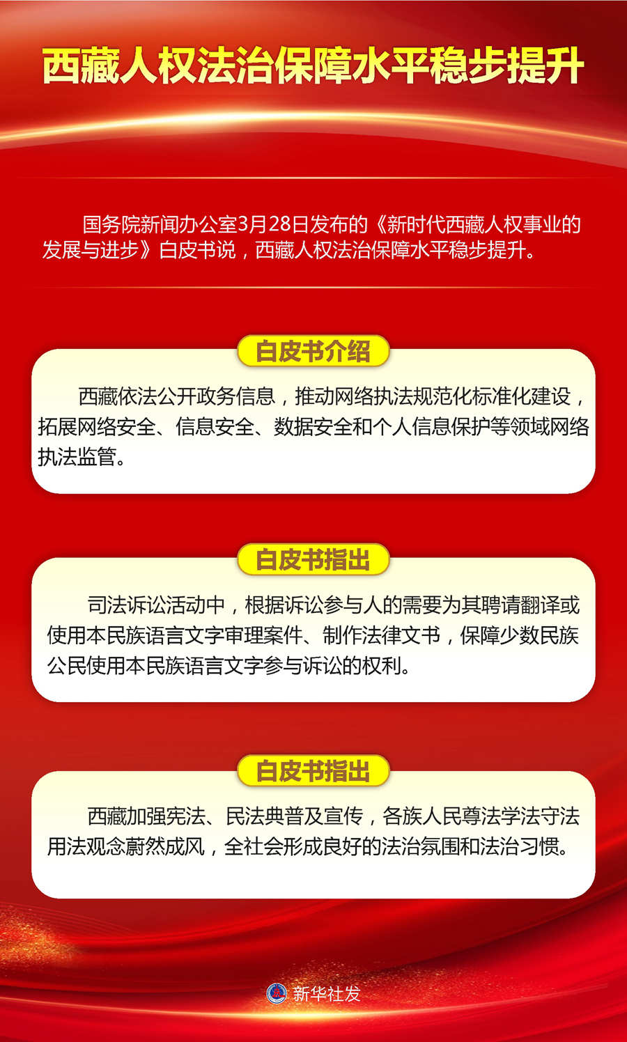 新华社拉萨3月28日电(记者唐健辉、黄耀漫)国务院新闻办公室28日发布的《新时代西藏人权事业的发展与进步》白皮书说,西藏人权法治保障水平稳步提升。