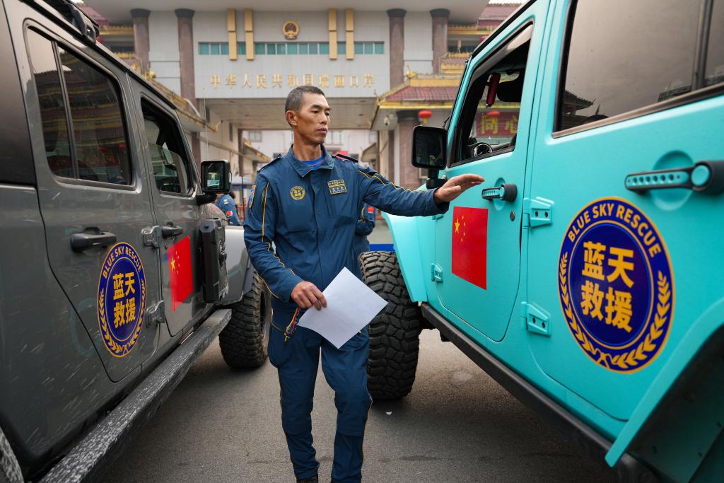 3月29日,蓝天救援队队员在云南瑞丽口岸上车,准备进入缅甸救援。新华社记者 陈欣波 摄