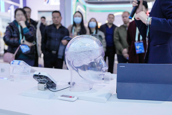 “这是中国自主研发的半侵入式脑机接口‘北脑一号’,它已完成3例人体试验……”开幕式所在的畅春厅外,外国人围着一个透明的脑部模型,竖起拇指。