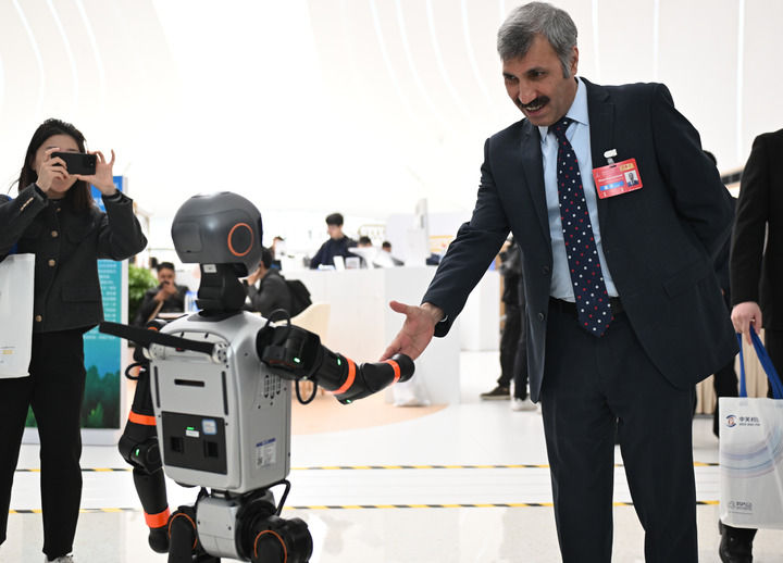 3月27日,2025中关村论坛年会与会嘉宾与一款加速T1机器人握手。新华社记者 张晨霖 摄