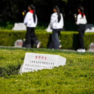 2025年4月1日,石家庄市宁安路小学学生在华北军区烈士陵园瞻仰雷烨等烈士的墓碑。新华社记者 刘金海 摄