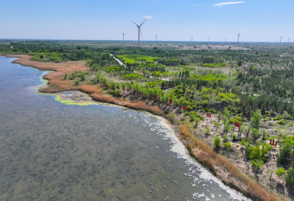 2024年5月15日,在内蒙古通辽市科尔沁沙地“双百万亩”综合治理工程努古斯台项目区,沙地上绿意盎然(无人机照片)。新华社记者连振摄