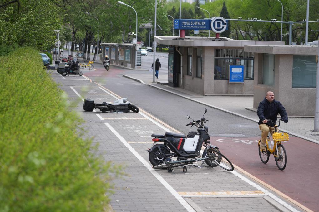 4月12日,一名男子在北京的大风中骑行。当日,我国北方多地出现大风降温天气。新华社记者 金立旺 摄