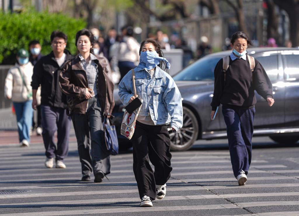 2025年4月14日,行人通过北京西单北大街和辟才胡同路口。当日白天,北京大风天气持续。据气象部门预报,白天阵风可达7至8级,西部和北部9级左右。夜间风力将明显减小。新华社记者 陈晔华 摄