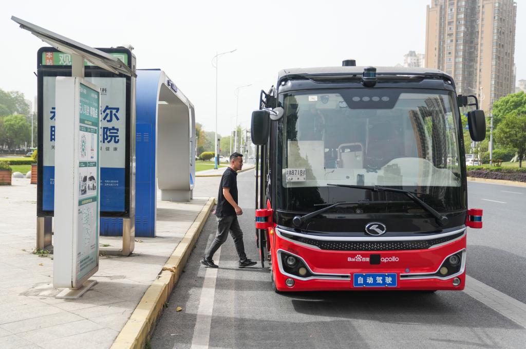 2025年4月13日,市民在重庆永川城区观音山公园站乘坐自动驾驶公交车。新华社发(陈安鑫摄)